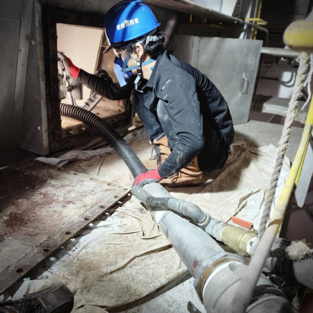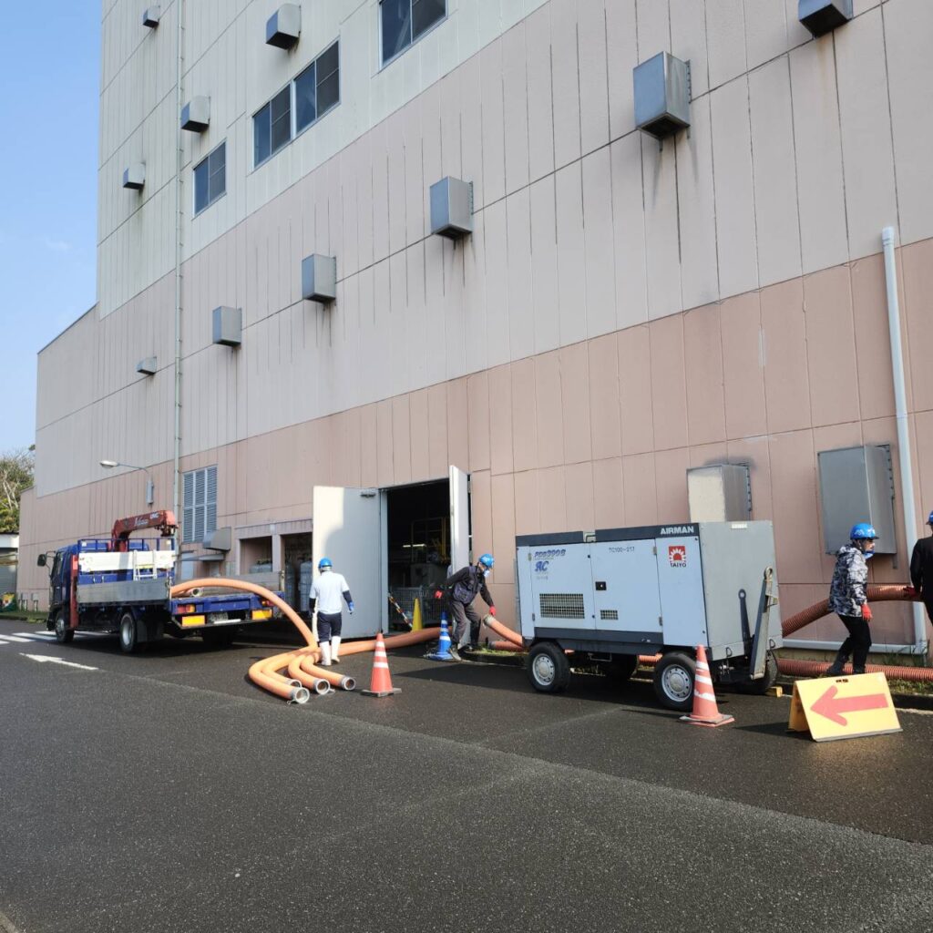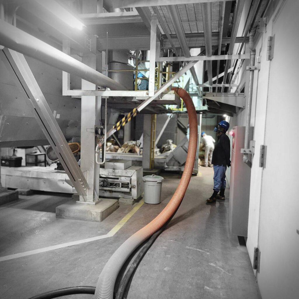 コンプレッサー(100ps)をご用意いただき、ジェクター・ジェクロンのセットと連結し、焼却灰の回収作業にご利用いただきました。